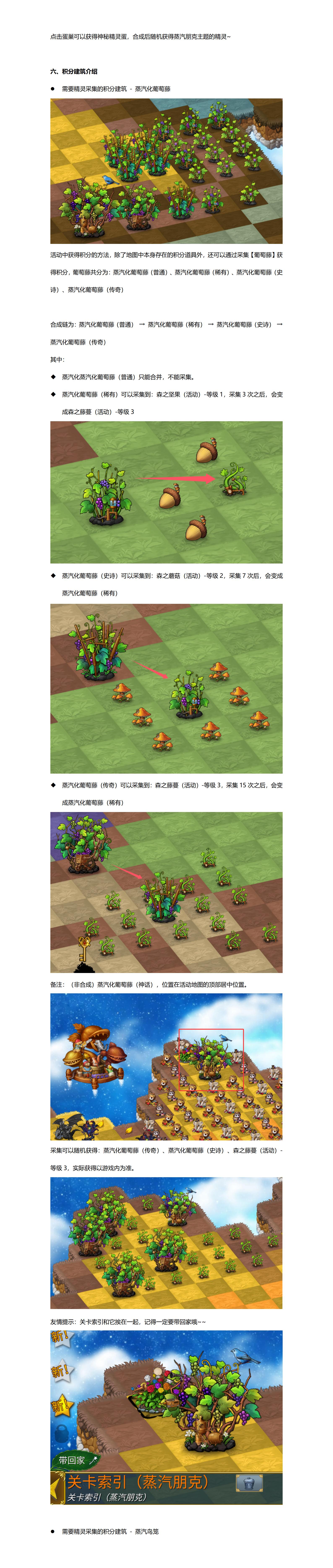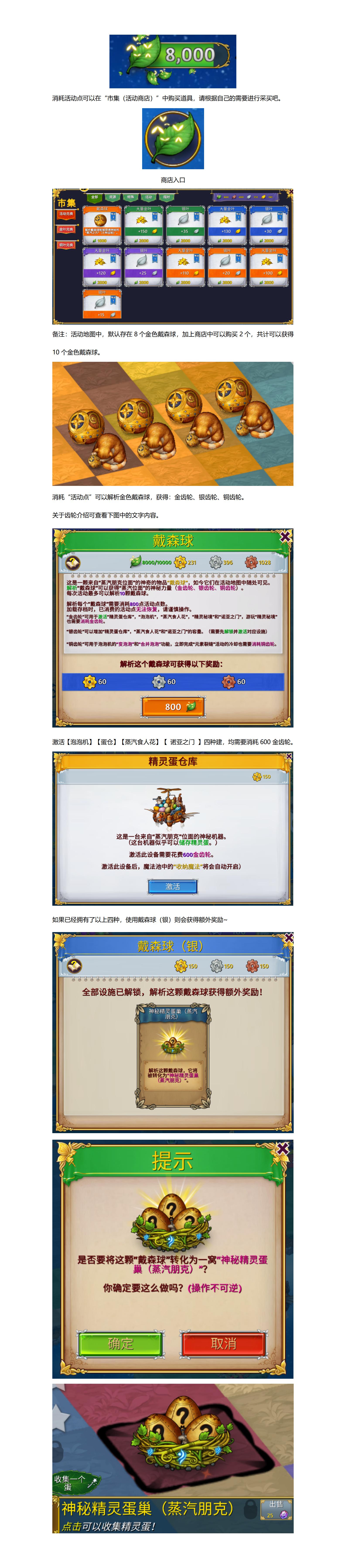 泡泡机:解锁并激活后,可以在家园使用“变泡泡”和“合并泡泡”功能。精灵蛋仓库:解锁并激活后,可以把家园内的精灵蛋存入精灵蛋仓库。蒸汽食人花:解锁并激活后,可以把家园和活动内的物品放入蒸汽食人花进行批量删除。诺亚之门:解锁并激活后,可以把家园内的物品复制到精灵家园。